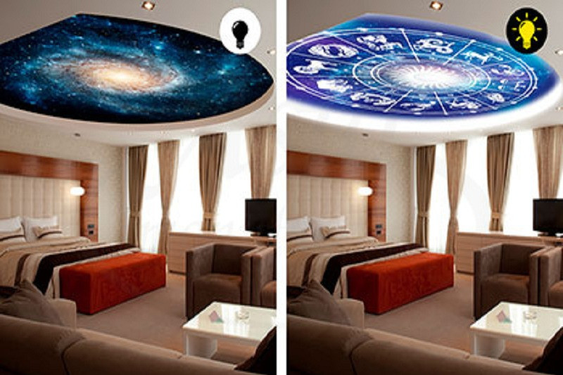 Потолки «звездное небо» представляют собой симбиоз натяжной системы и светодиодного оборудования. Чтобы создать такой потолок, сначала нужно уделить внимание выбору полотна, которое может быть практически любой цветовой гаммы – от светло-синего, до глубокого черного. Имитация звездного неба может быть в виде фотопечати, светодиодной подсветки, сочетания первого и второго приема. Дополнительно могут использоваться специальные проекторы и другие виды осветительного оборудования, от которых будет зависеть, сколько стоит система.