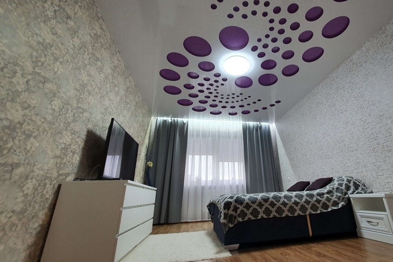 Монтаж сатинового натяжного потолка больше всего уместен спальне. Уникальное покрытие с эффектом перламутра наполняет комнату теплым светом, при этом без неприятных бликов. Также оно подходит для гостиной, детской, в зависимости от выбранного оттенка и дополнительного декора для ванной, кухни.