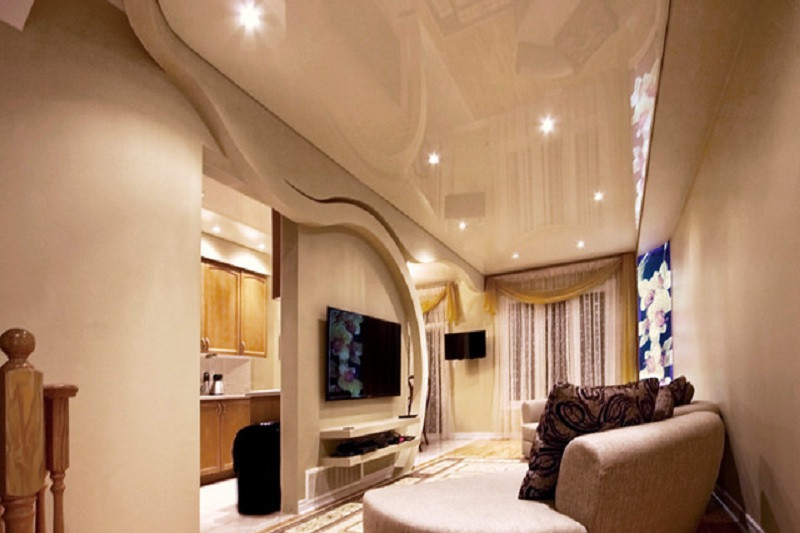 Помимо квадратуры помещения, нужно учитывать еще и уровень освещения. Если комната очень темная, то лучше отдать предпочтение светлым оттенкам, которые будут делать ее более уютной, глянец, в свою очередь, поможет решить проблемы с маленькой площадью, визуально ее увеличивая. Идеальный вариант – выбор белого глянцевого потолка. Для помещений с хорошим уровнем освещения можно выбирать покрытия любых оттенков, главное, учесть цветовую гамму интерьера.