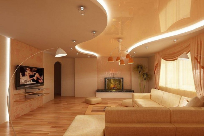 Конструкции для гостиной могут быть абсолютно любой конфигурации, в реализации дизайнерских задумок играют роль планировка комнаты и высота ее потолка. Если квадратура помещения позволяет устанавливать сложные системы, можно выбрать натяжные потолки двухуровневые, многоуровневые, декорированные различными элементами.