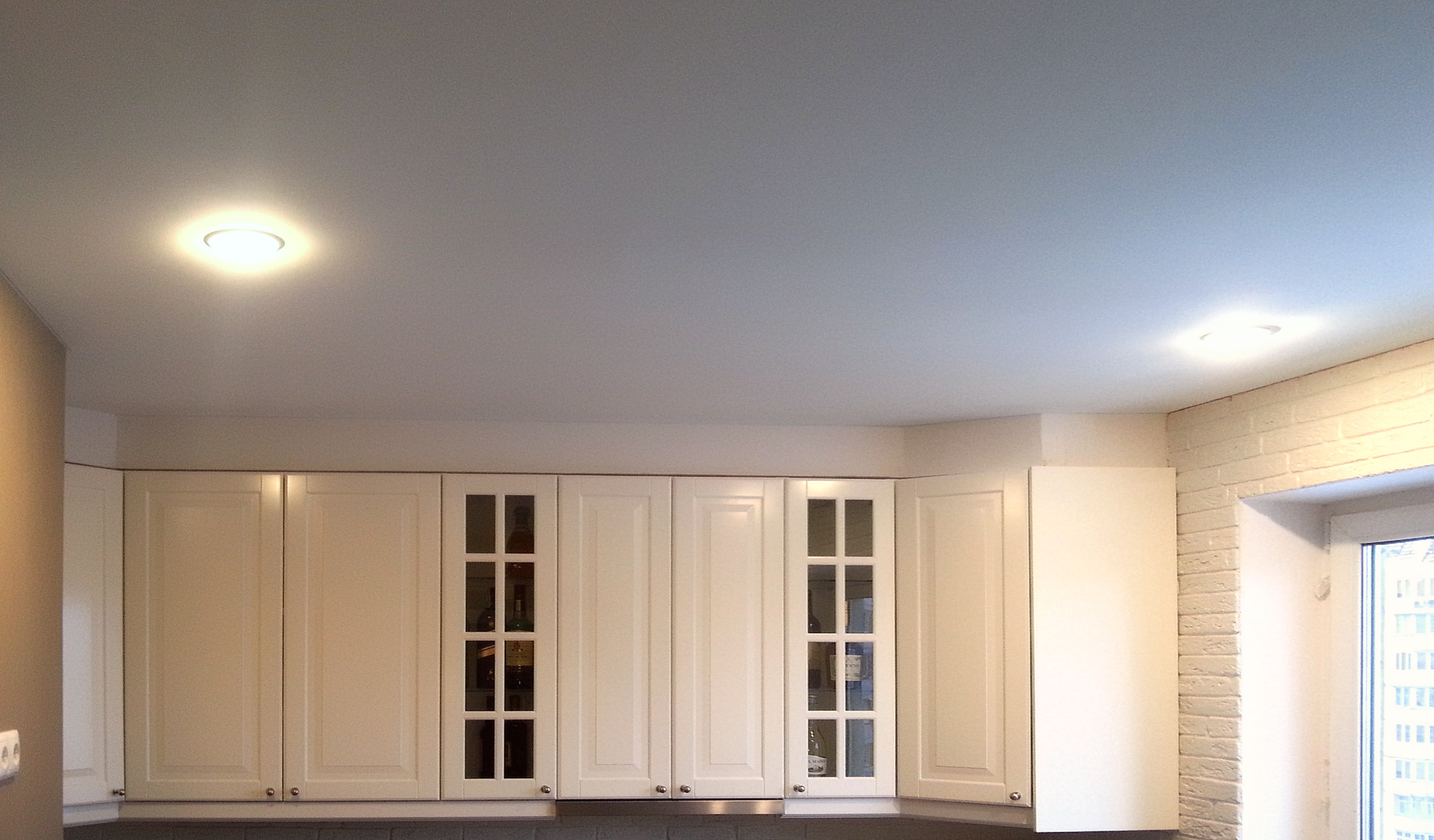 Цена монтажа натяжного потолка на кухне зависит от материала, сложности конструкции, количества расходных материалов и дополнительного оформления.