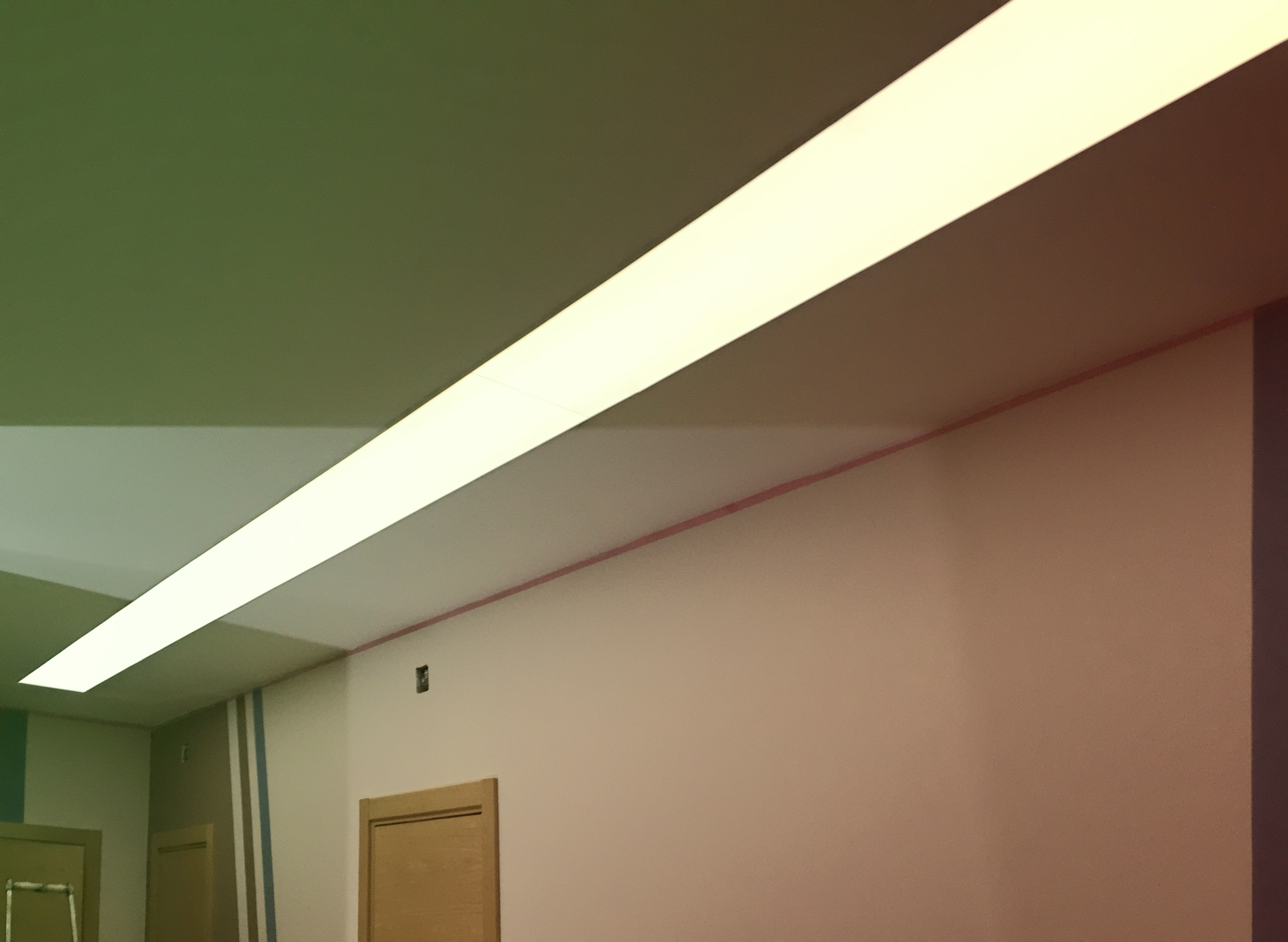 «Парящая» конструкция создается с помощью светодиодной ленты, которая помещается в профиль, установленный по периметру потолка, она может монтироваться как сверху полотна, так и за ним.