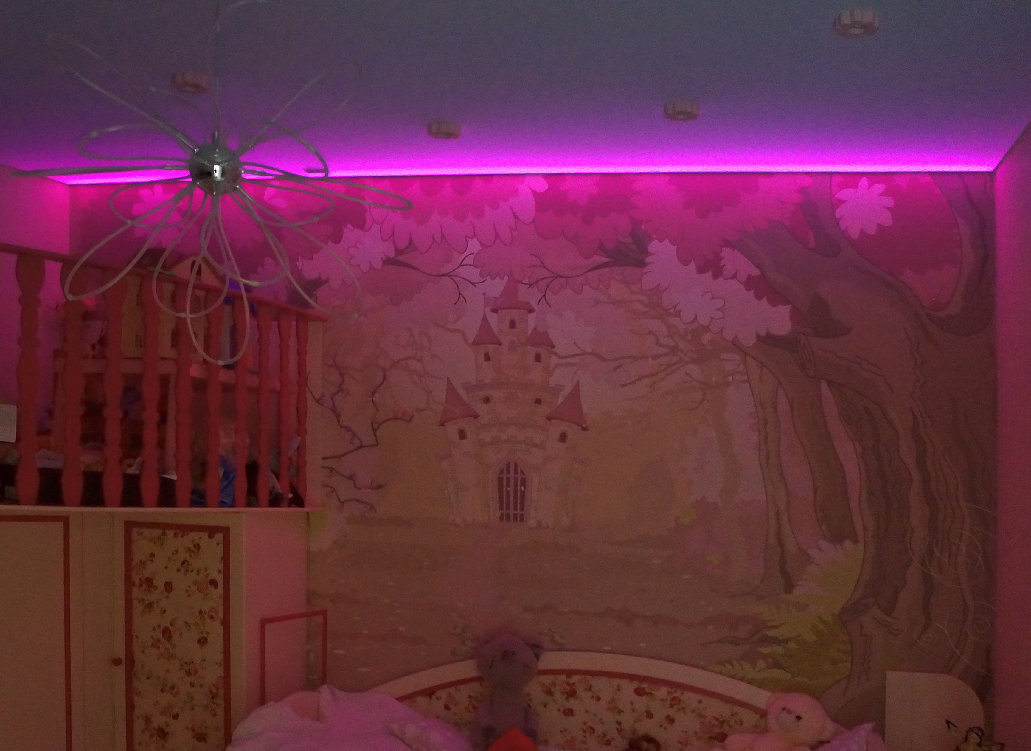 Особенность потолка с подсветкой – в визуальном увеличении пространства, создании эффекта невесомости конструкции, поэтому его можно установить в любой комнате. Если высота базового потолка небольшая, можно использовать одноуровневые системы.