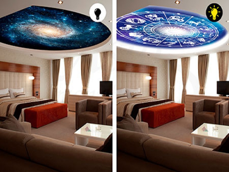 Потолки «звездное небо» представляют собой симбиоз натяжной системы и светодиодного оборудования. Чтобы создать такой потолок, сначала нужно уделить внимание выбору полотна, которое может быть практически любой цветовой гаммы – от светло-синего, до глубокого черного. Имитация звездного неба может быть в виде фотопечати, светодиодной подсветки, сочетания первого и второго приема. Дополнительно могут использоваться специальные проекторы и другие виды осветительного оборудования, от которых будет зависеть, сколько стоит система.