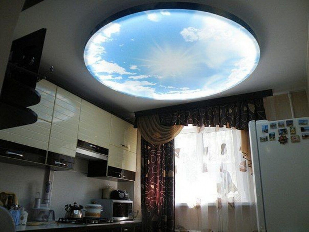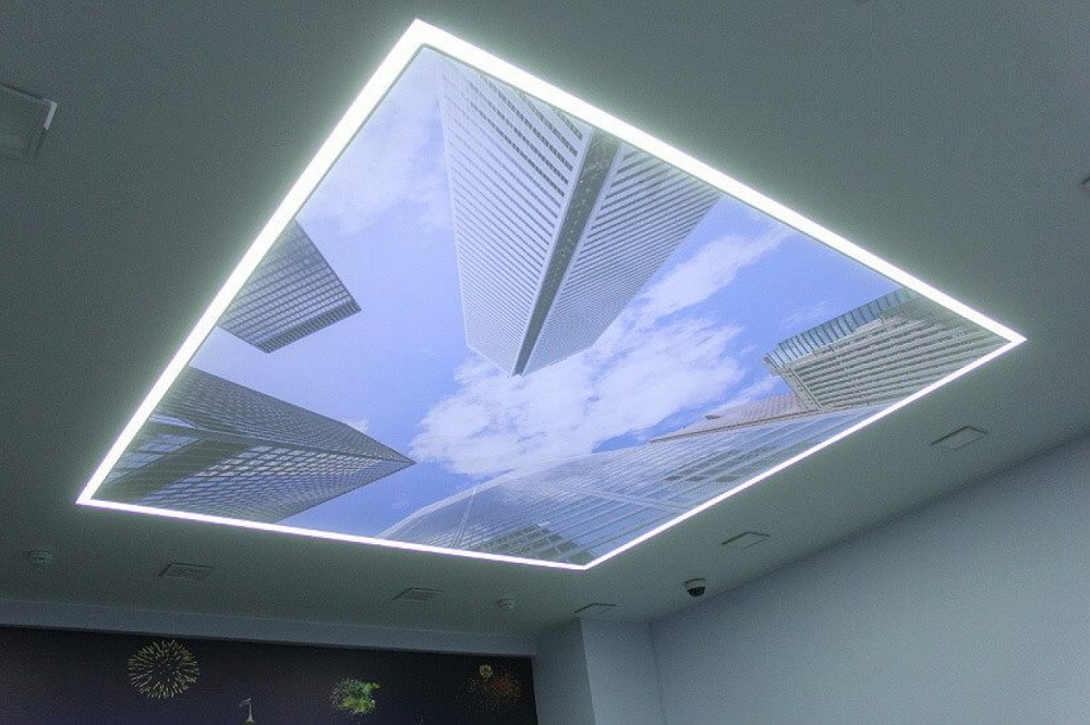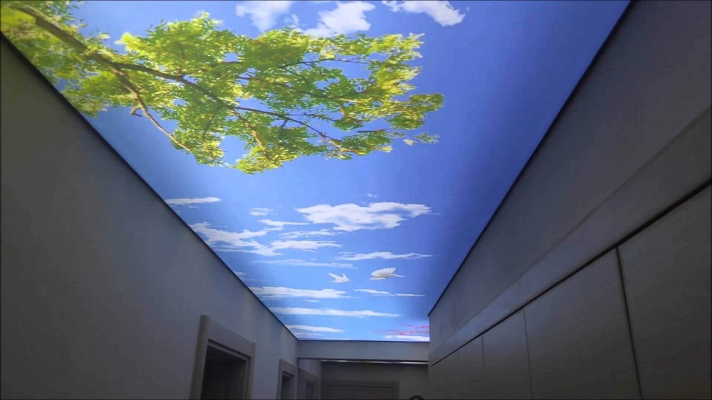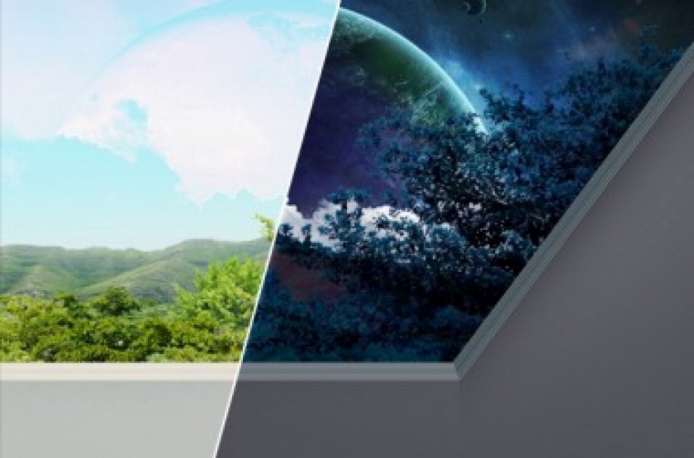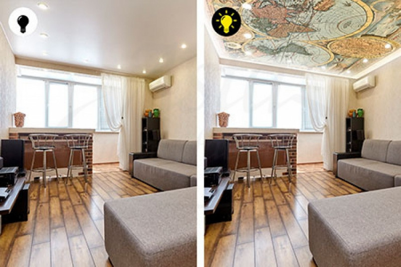 При выборе натяжного потолка с фотопечатью важно не только правильно его установить, но и «преподнести». Использование продуманного освещения позволяет акцентировать внимание на изображении, например, принт звездного неба, облаков с солнцем, освещенный подсветкой, будет выглядеть максимально реалистично.