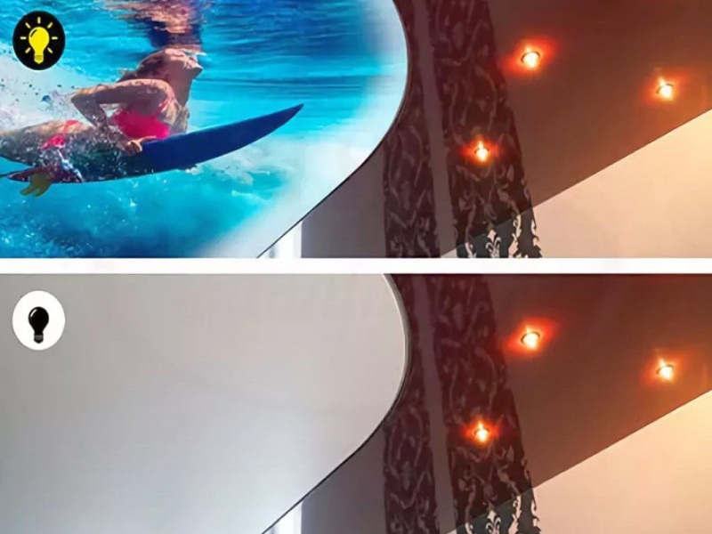 Цены на глянцевые полотна, независимо от их оттенка, одинаковы. Цена готового потолка зависит от его конфигурации, площади комнаты, количества и видов осветительных приборов, наличия дополнительного декора (прокладка светодиодной ленты, фотопечать и т. д.).
