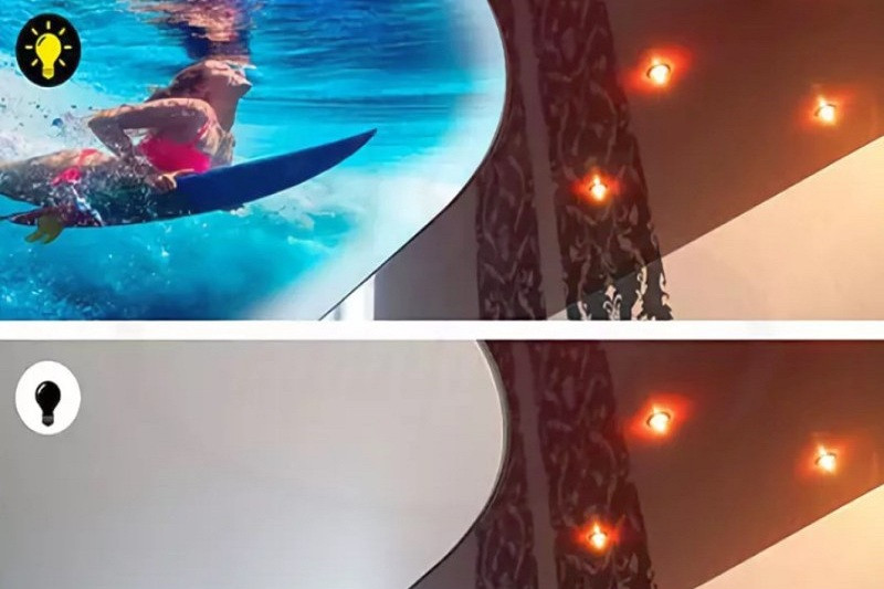 Одна из особенностей потолка с перламутровым эффектом – свойство менять свой оттенок в зависимости от освещения. Если посмотреть на натяжной потолок с фото без искусственного света, на нем покрытие будет более естественным, чем при включении освещения, – при попадании световых лучшей от осветительных приборов оно становится более светлым. При установке такого потолка можно выбирать любые источники света, но важно учитывать их цветовую температуру, мощность свечения и т. д.