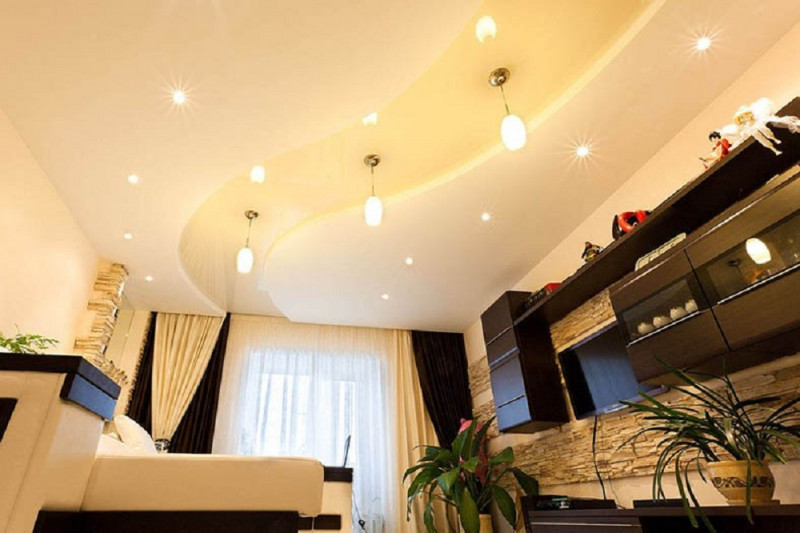 Потолочная система в несколько уровней особенно уместна в гостиной и на кухне. При выборе подходящей конструкции важно учитывать высоту полотка, если она менее 2,4 м, лучше отдать предпочтение одноуровневым вариантам.