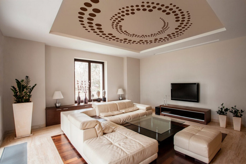 Конструкции для гостиной могут быть абсолютно любой конфигурации, в реализации дизайнерских задумок играют роль планировка комнаты и высота ее потолка. Если квадратура помещения позволяет устанавливать сложные системы, можно выбрать натяжные потолки двухуровневые, многоуровневые, декорированные различными элементами.