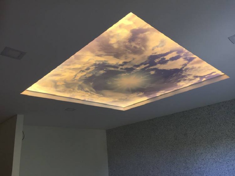 При выборе натяжного потолка с фотопечатью важно не только правильно его установить, но и «преподнести». Использование продуманного освещения позволяет акцентировать внимание на изображении, например, принт звездного неба, облаков с солнцем, освещенный подсветкой, будет выглядеть максимально реалистично.
