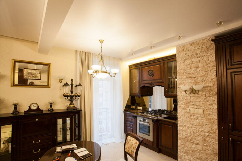 Цена монтажа натяжного потолка на кухне зависит от материала, сложности конструкции, количества расходных материалов и дополнительного оформления.