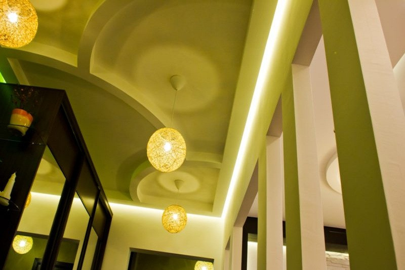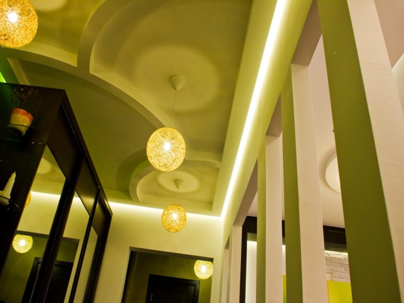 Потолочное покрытие актуально для любого помещения, главное – правильно выбрать конфигурацию системы, места прокладки ленты или установки светильников.