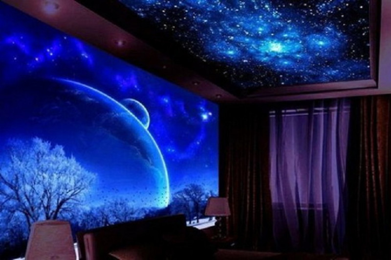 Потолки «звездное небо» представляют собой симбиоз натяжной системы и светодиодного оборудования. Чтобы создать такой потолок, сначала нужно уделить внимание выбору полотна, которое может быть практически любой цветовой гаммы – от светло-синего, до глубокого черного. Имитация звездного неба может быть в виде фотопечати, светодиодной подсветки, сочетания первого и второго приема. Дополнительно могут использоваться специальные проекторы и другие виды осветительного оборудования, от которых будет зависеть, сколько стоит система.