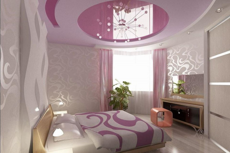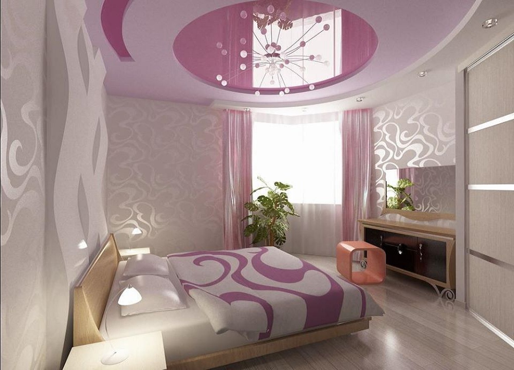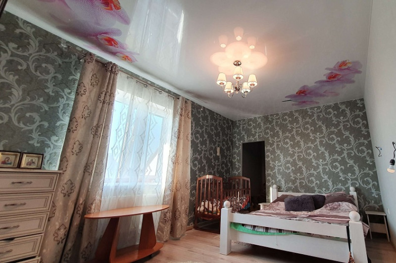 Монтаж сатинового натяжного потолка больше всего уместен спальне. Уникальное покрытие с эффектом перламутра наполняет комнату теплым светом, при этом без неприятных бликов. Также оно подходит для гостиной, детской, в зависимости от выбранного оттенка и дополнительного декора для ванной, кухни.